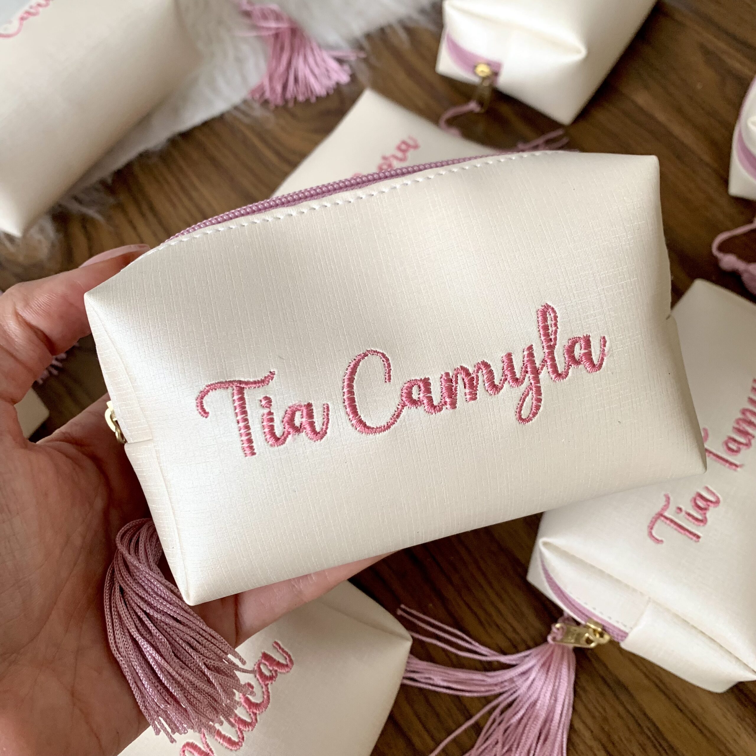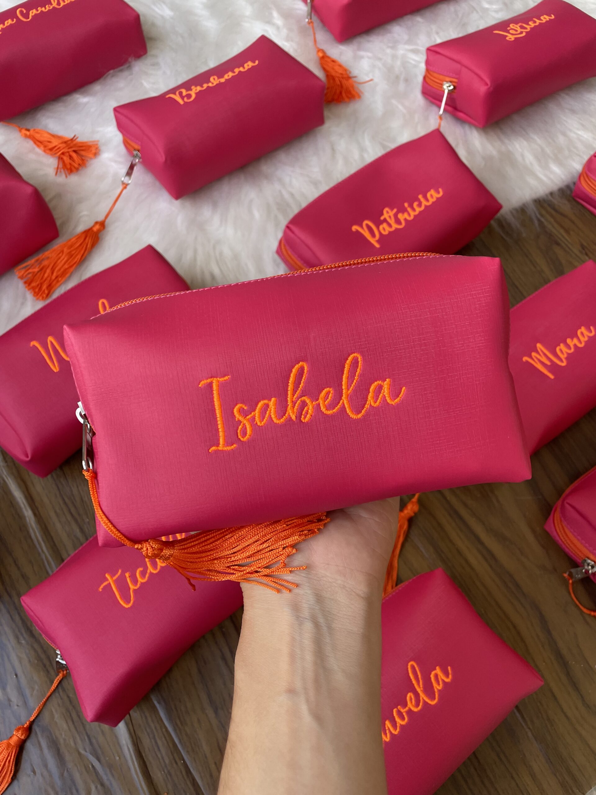 Essa é a necessaire que não pode faltar nunca! O modelinho mais certeiro quando você desejar presentear convidados ou clientes. Personalizada com seu nome ou nomes dos convidados.